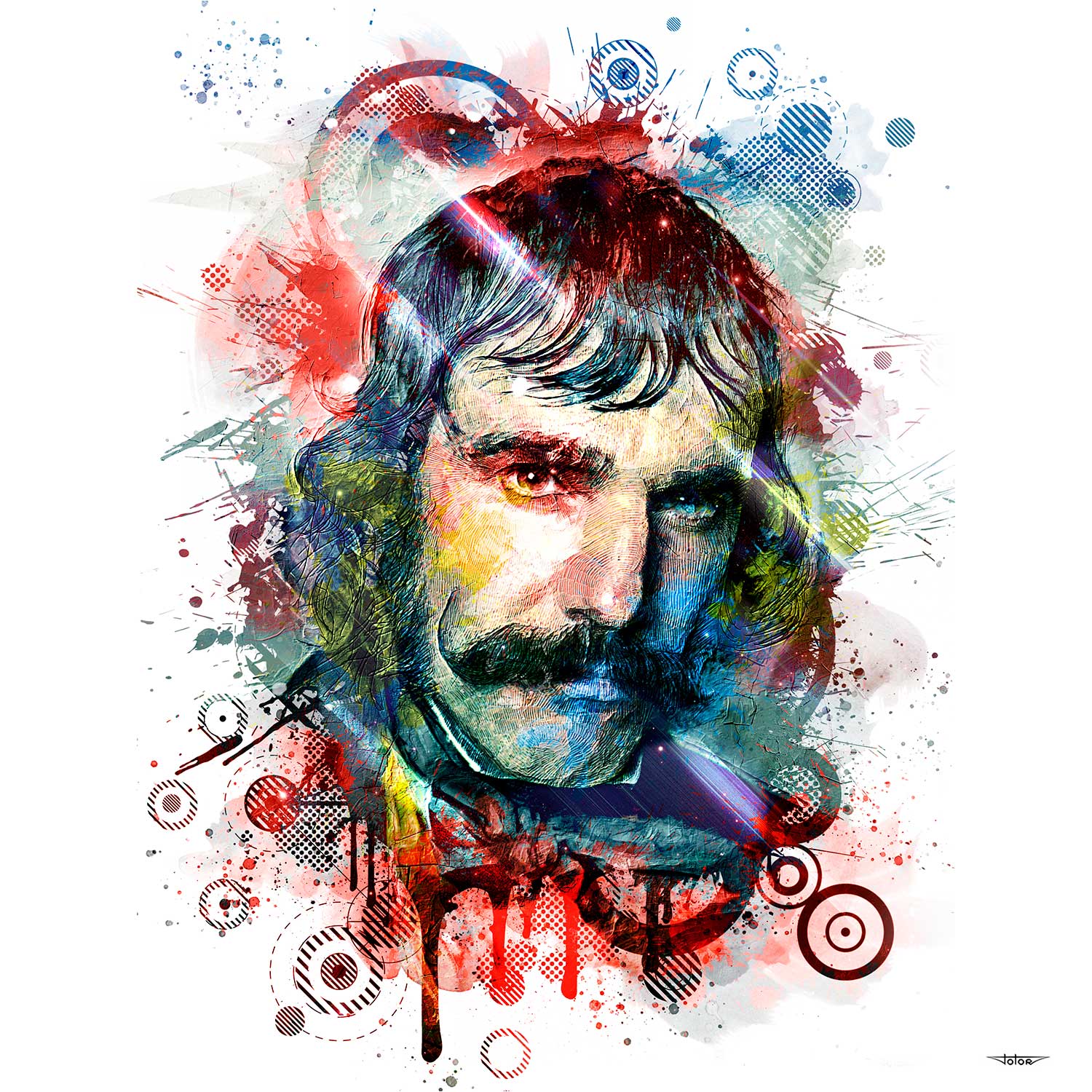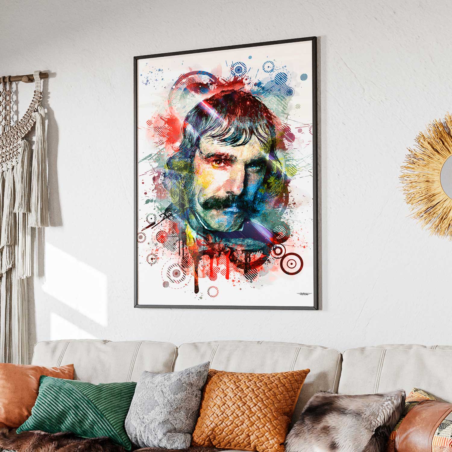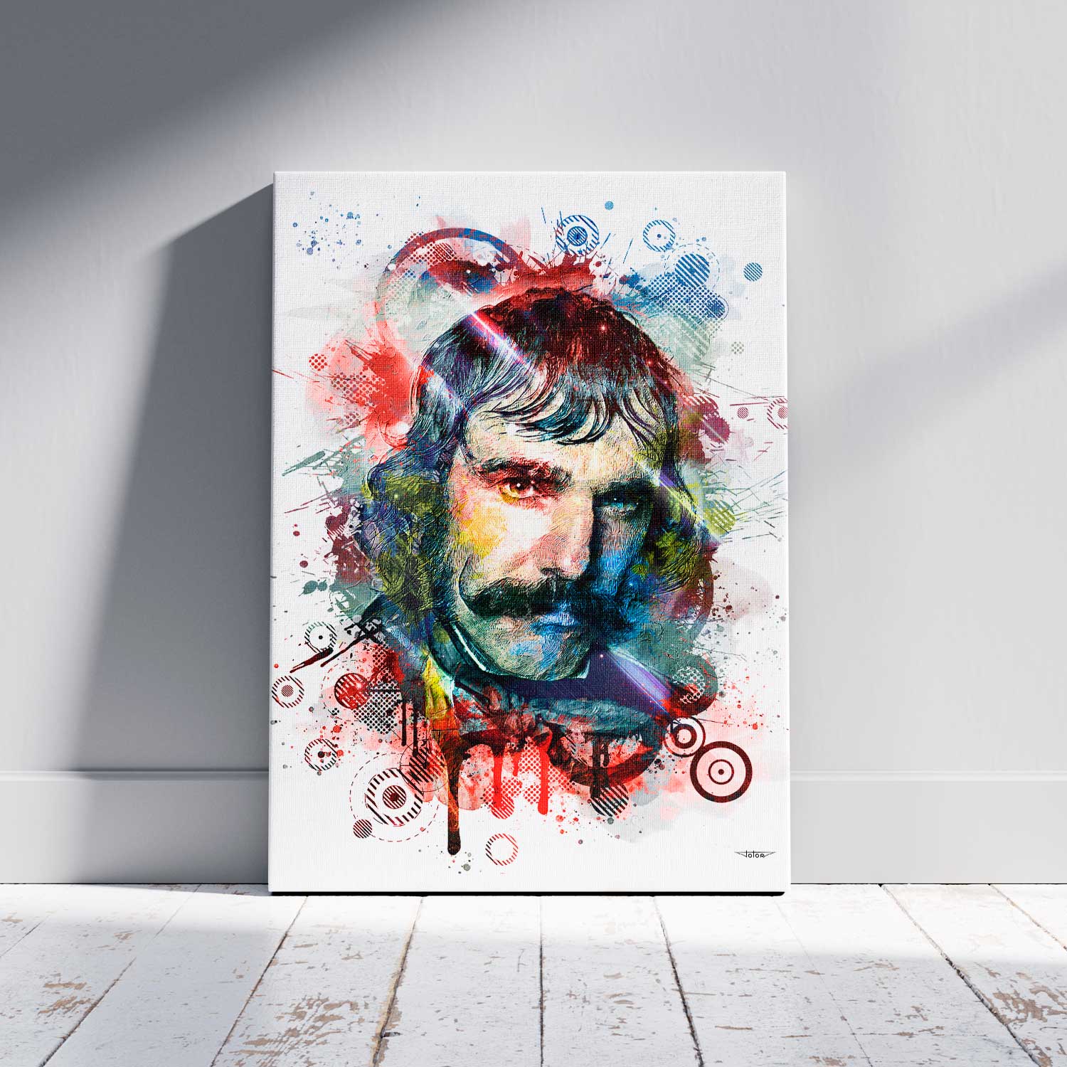 Ce tableau de Daniel Day-Lewis dans Gangs of New York s’inspire directement de cette présence écrasante. Le regard est frontal, dur, presque provocateur. L’œil ne cherche pas la sympathie : il jauge. La pose évoque l’arrogance tranquille de celui qui sait qu’il règne, même lorsque tout vacille autour de lui. Ici, pas de folklore gratuit : chaque détail graphique sert le personnage, son époque, sa brutalité ritualisée.