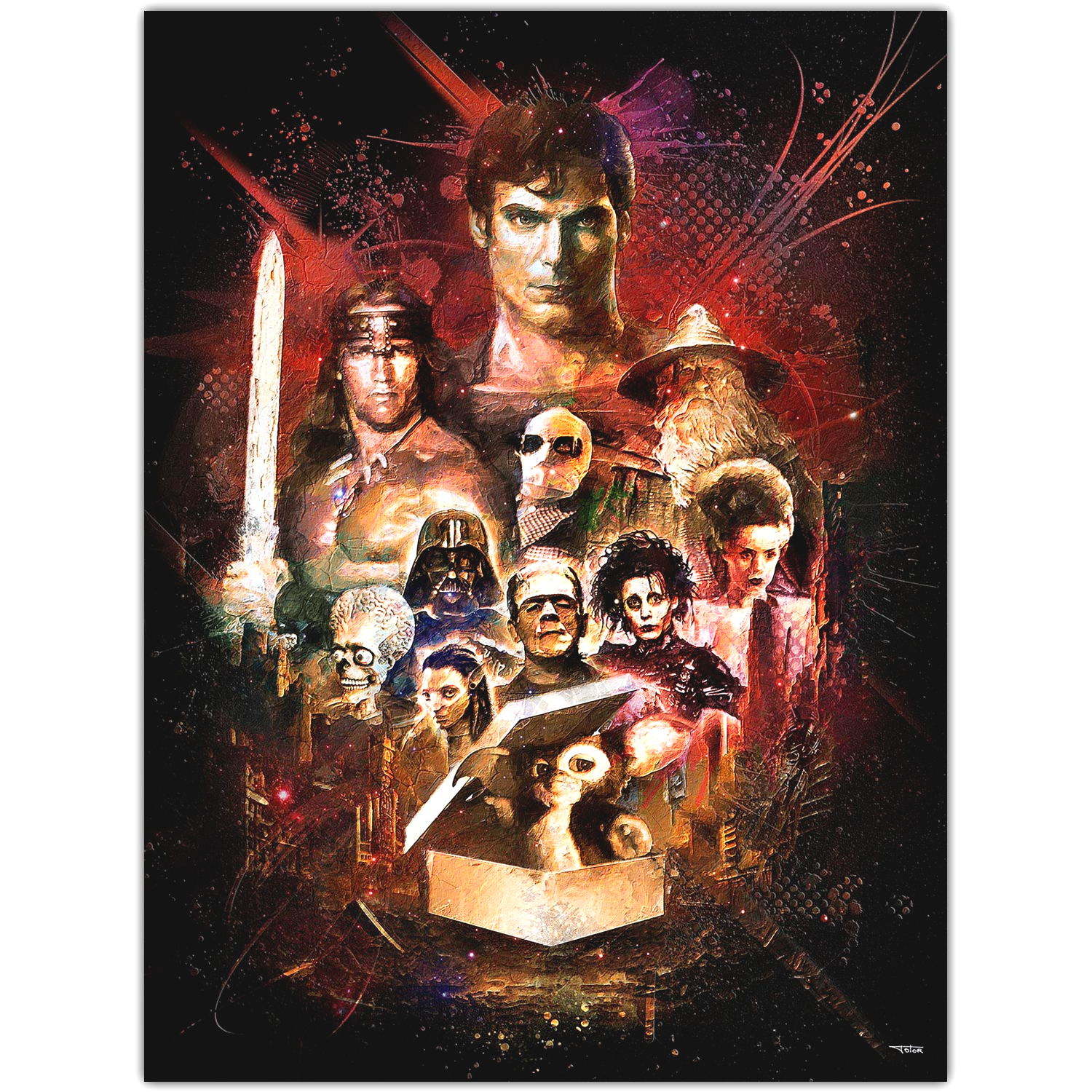 Passionné de cinéma fantastique ? N’hésitez plus ! Cette peinture de quelques personnages cultes du cinéma fantastique agencés dans une composition graphique originale vous comblera.