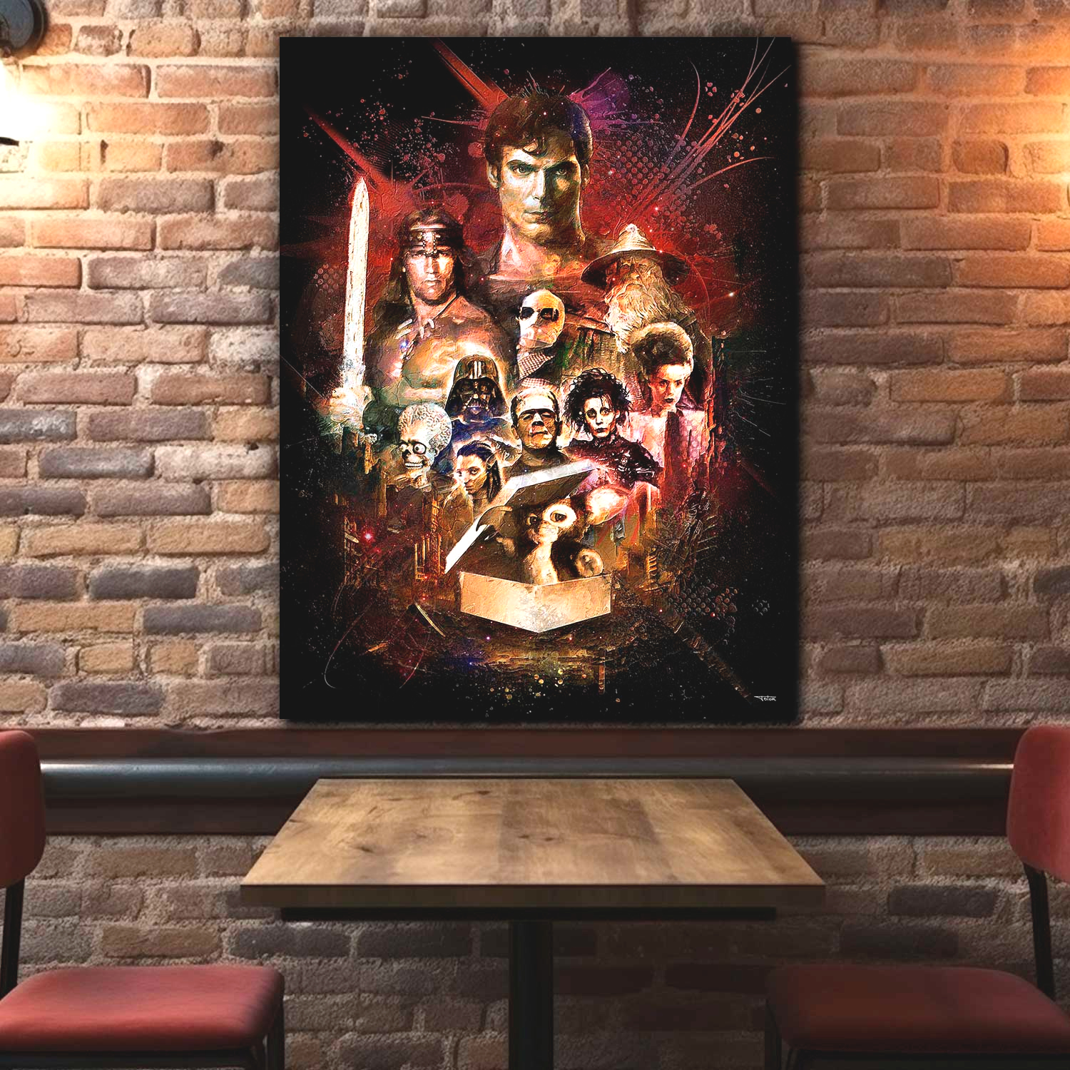 La décoration d’intérieur reflète vos sensibilités, n’hésitez pas à les laisser s’exprimer avec ce tableau des icônes du cinéma fantastique en édition limitée collector, peinture aquarelle digitale !