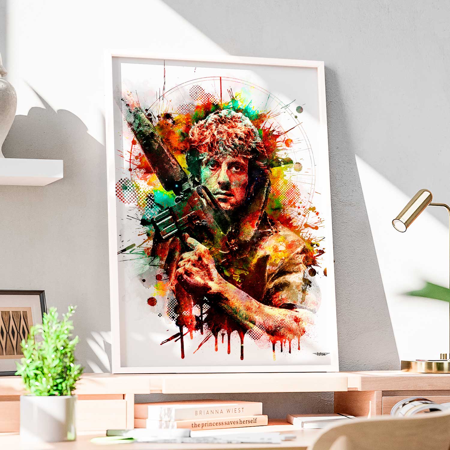 Avec ce tableau de Sylvester Stallone dans Rambo, Splashed! rend hommage à l’action culte des années 80 tout en ajoutant une touche artistique et décalée.
